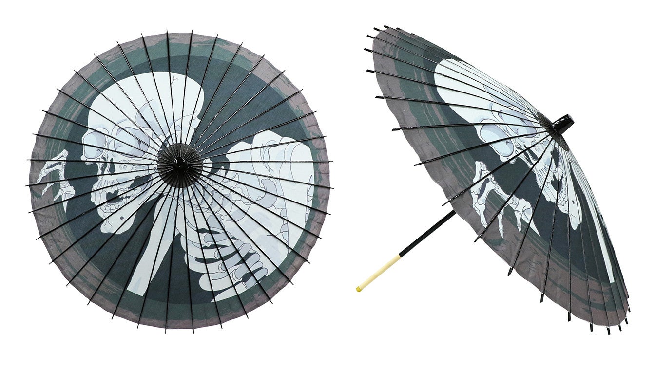 おどろおどろしい日本の妖怪「がしゃどくろ」が覗き見る、インパクトある舞妓傘です。「がしゃどくろ」は、埋葬されなかった死者たちの骸骨や怨念が集まって巨大な骸骨の姿になった妖怪です。歌川国芳の浮世絵『相馬の古内裏』に描かれた巨大な骸骨の絵が、現代におけるがしゃどくろの出自と言われています。