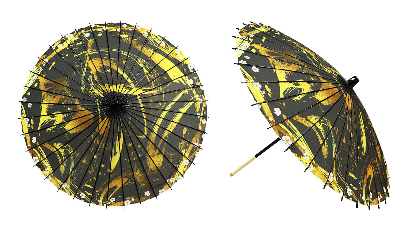 慎ましい白梅の花と豪奢な金箔風のデザインが美しい華やかな「舞妓傘」です。白梅と流水のようなデザインは、江戸時代中期に活躍した画家・工芸家の尾形光琳「紅白梅図屛風」から着想を得ています。