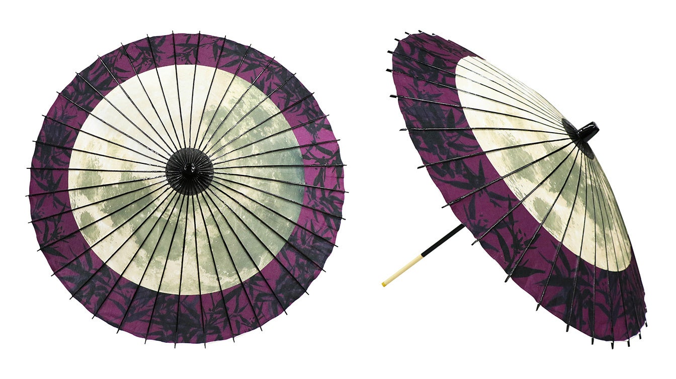 幻想的な満月を日本の伝統的な傘の柄「蛇の目」風の構図で仕上げました。一見シンプルながらも、遠くから見ると伝統的な蛇の目の和傘、近くで見ると綺麗な満月といった遊び心を加えた舞妓傘です。